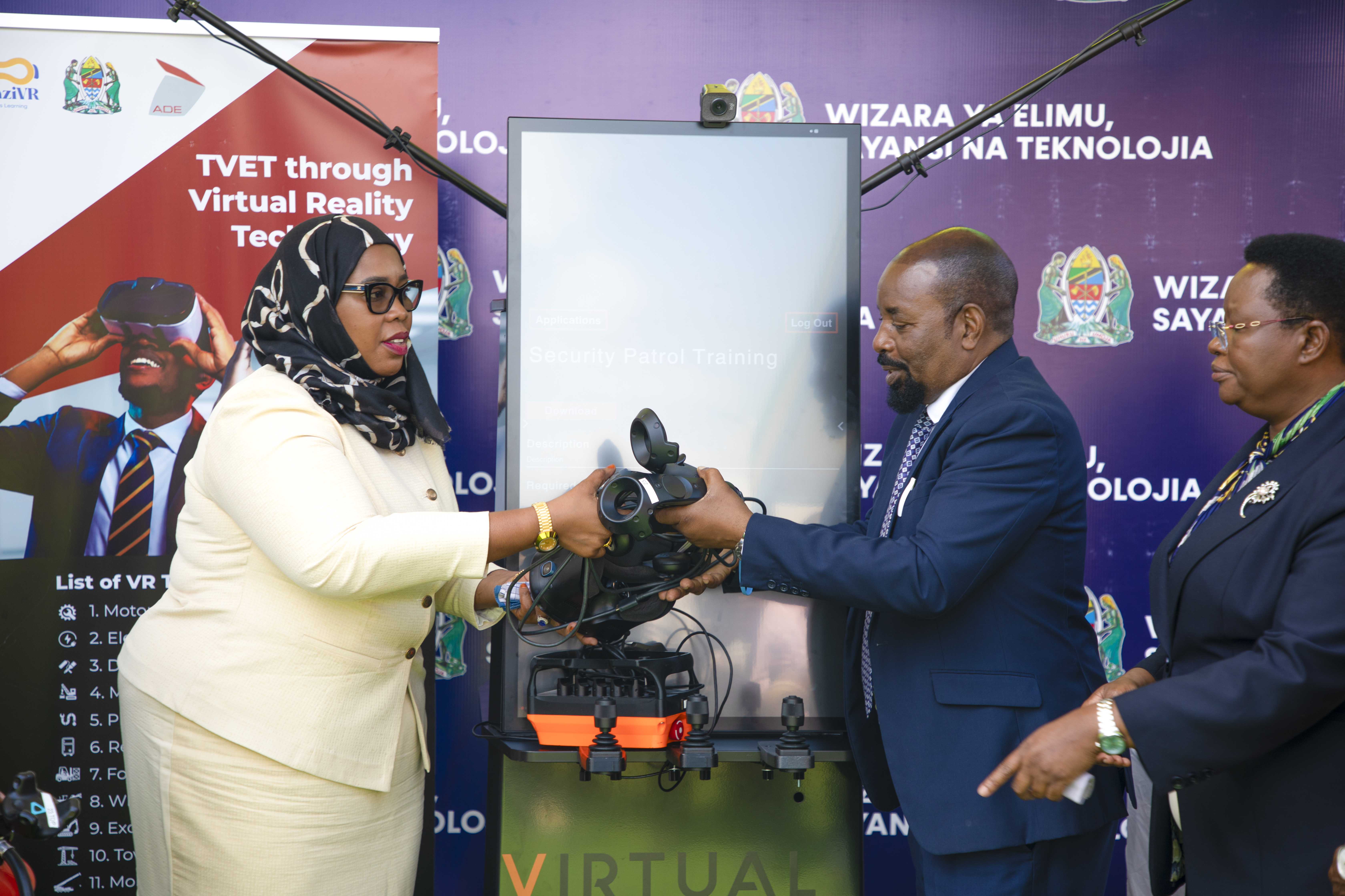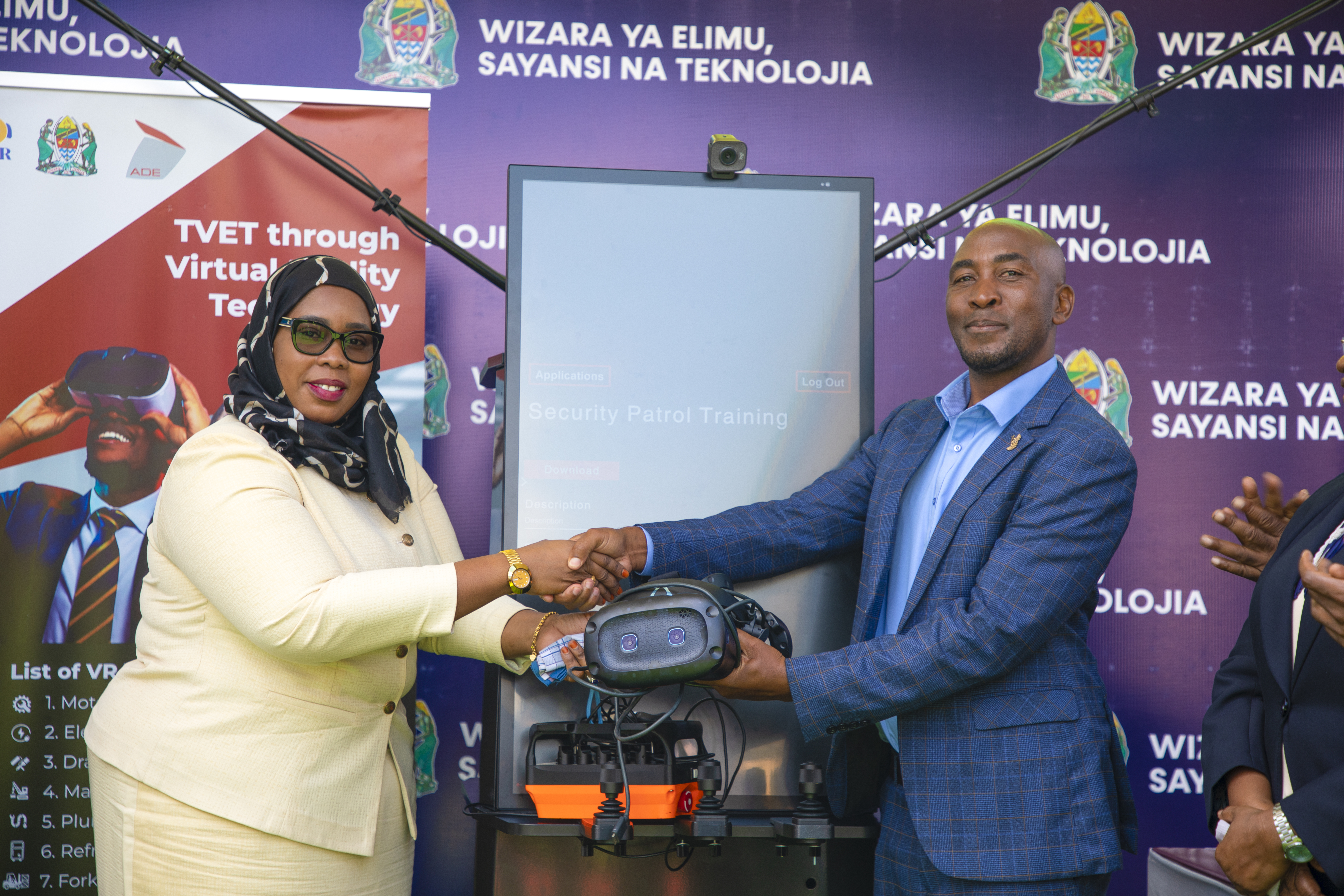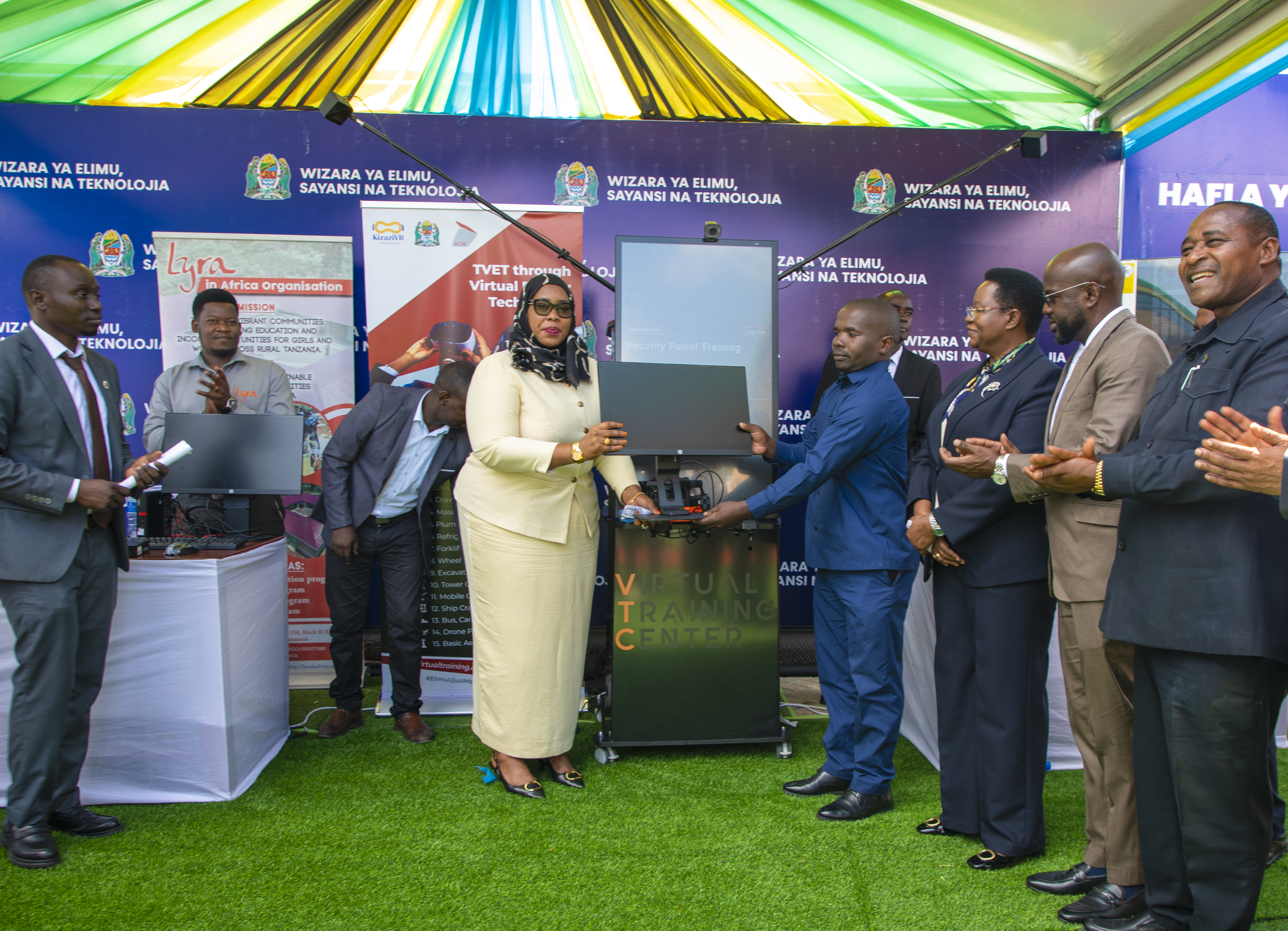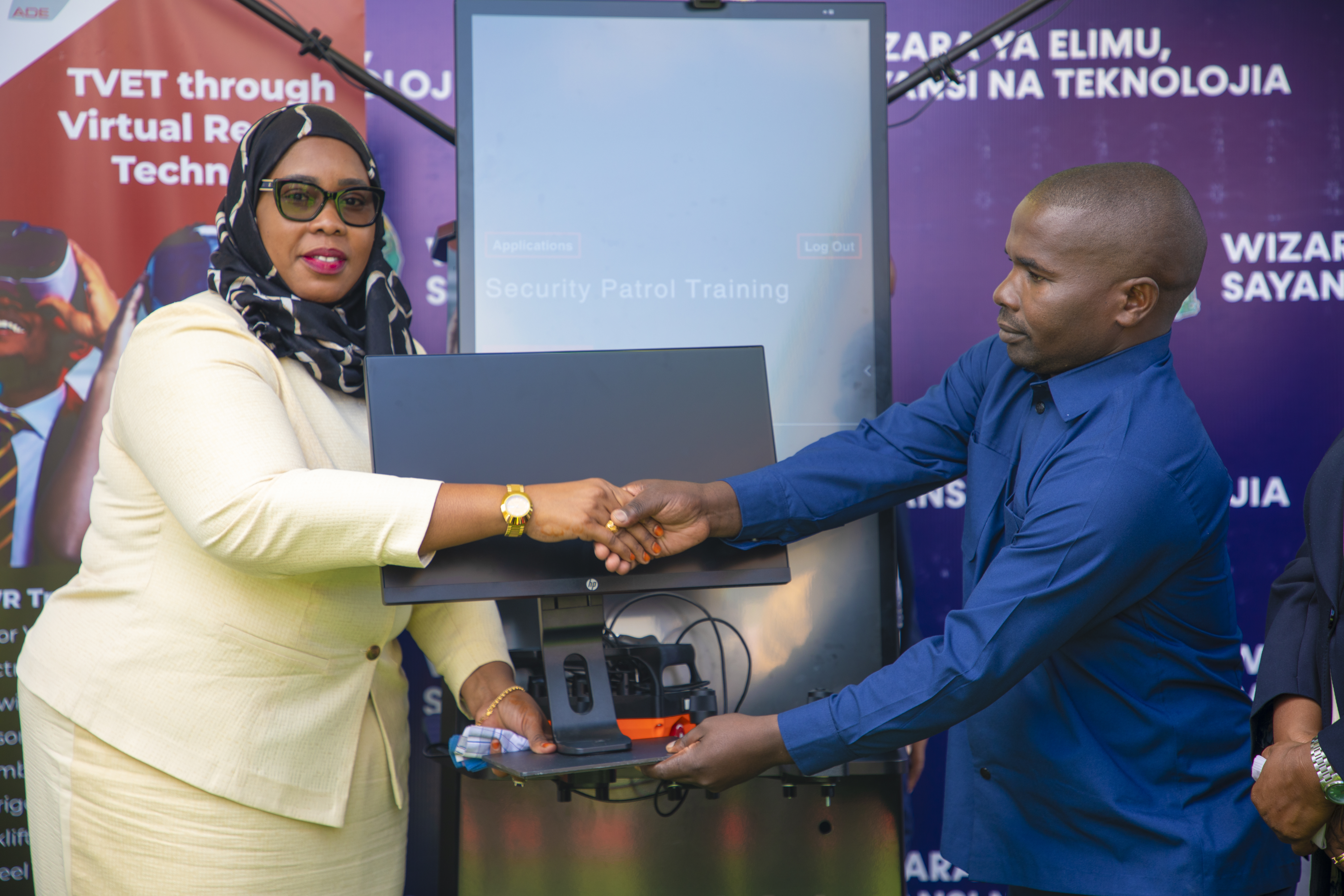 Naibu Waziri wa Elimu, Sayansi na Teknolojia, Mhe. Wannu Hafidh Ameir, akikabidhi vifaa vya TEHAMA kwa Wakuu wa shule za msingi na sekondari kutoka mikoa tisa ya Tanzania Bara na Visiwani.