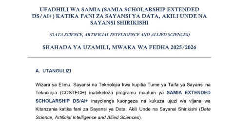 • UFADHILI WA SAMIA (SAMIA SCHOLARSHIP EXTENDED DS/ AI+) KATIKA FANI ZA SAYANSI YA DATA, AKILI UNDE NA SA YANSI SHIRIKISHI