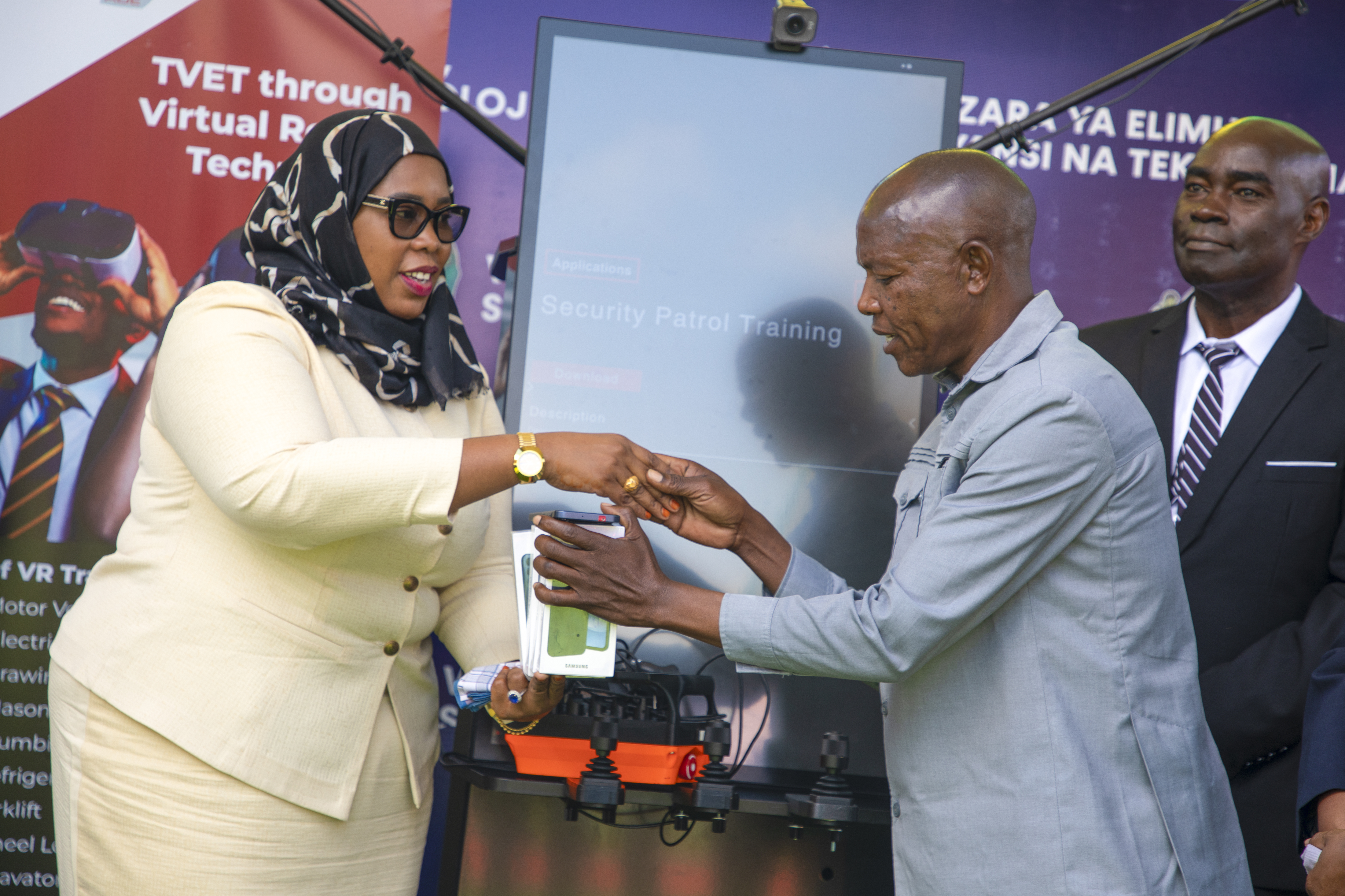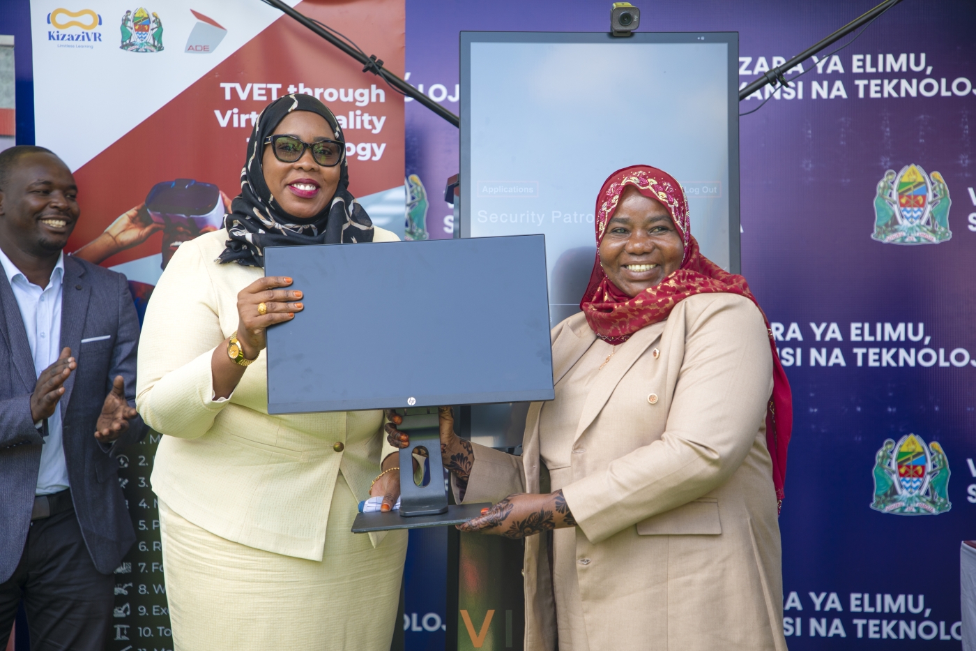 Naibu Waziri wa Elimu, Sayansi na Teknolojia, Mhe. Wannu Hafidh Ameir, akikabidhi vifaa vya TEHAMA kwa Wakuu wa shule za msingi na sekondari kutoka mikoa tisa ya Tanzania Bara na Visiwani.